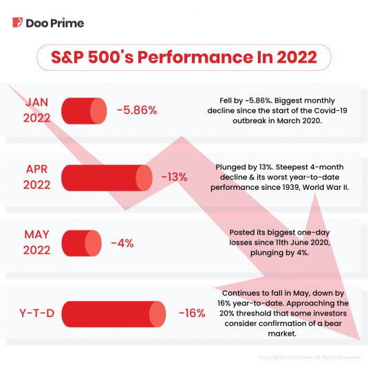 On Wednesday, 19th May 2022, the S&P 500 posted its biggest one-day losses since 11th June 2020, plunging by 4% or 165.17 points to finish at 3,923.68 points.