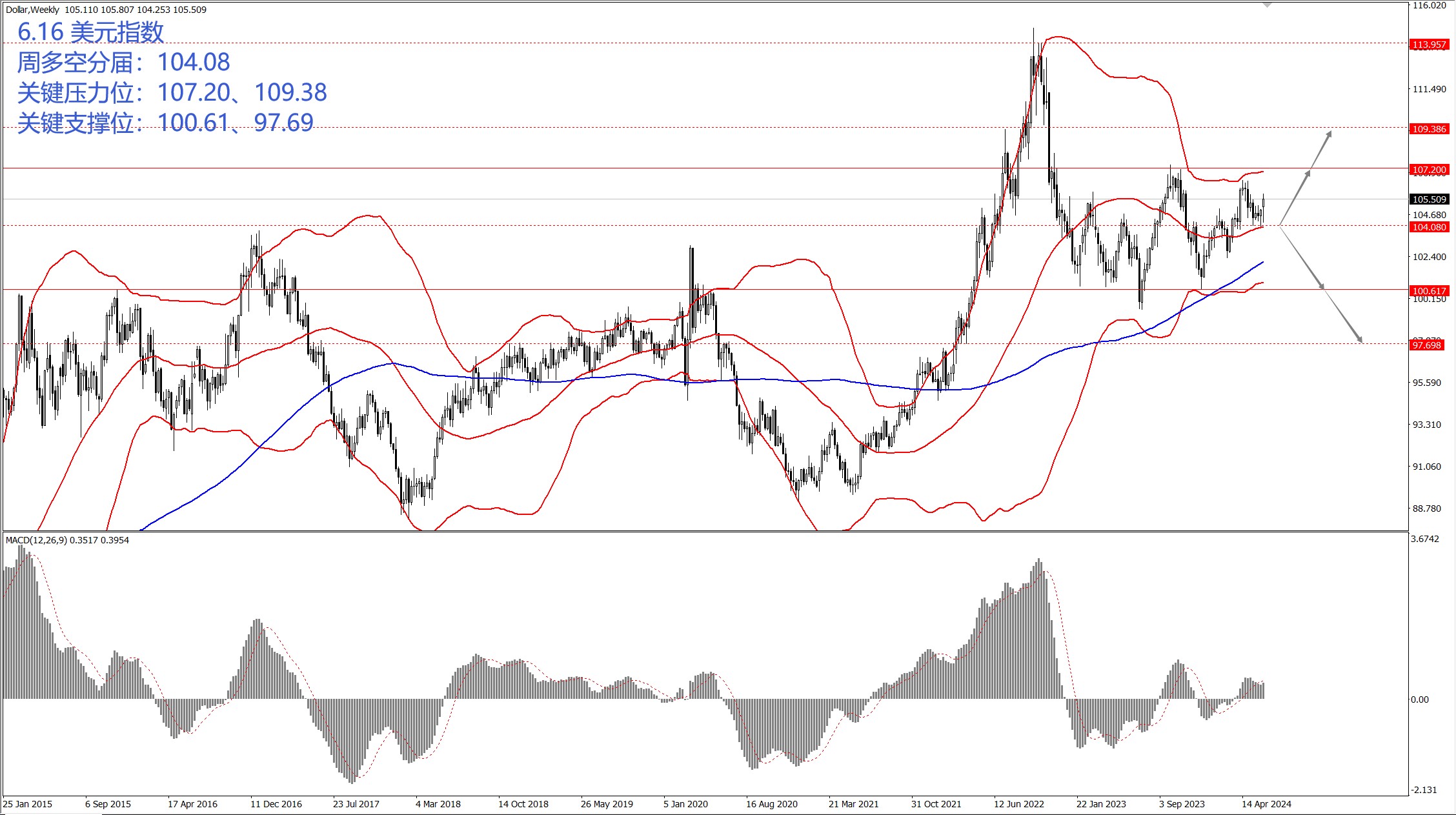 - 从技术层面上,下周主要关注周多空分届 104.08 一线,如果美指运行于 104.08 一线上方,届时则关注区间上边界 107.20 和 109.38 两个位置的压制力度,尤其关注震荡区间上边界 107.20 一线的压制力度;