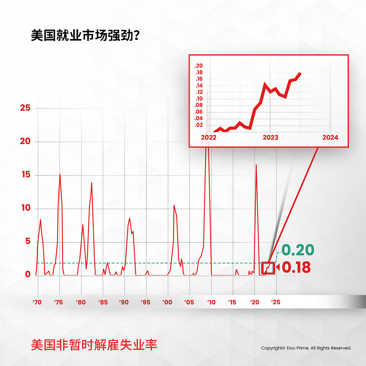 从历史上看,当这一差异超过 0.20% 时,意味着经济衰退的风险将增加。目前,数据处于令人担忧的近 0.18%。尽管还没有进入衰退,但我们应该关注这些潜在的失业率。