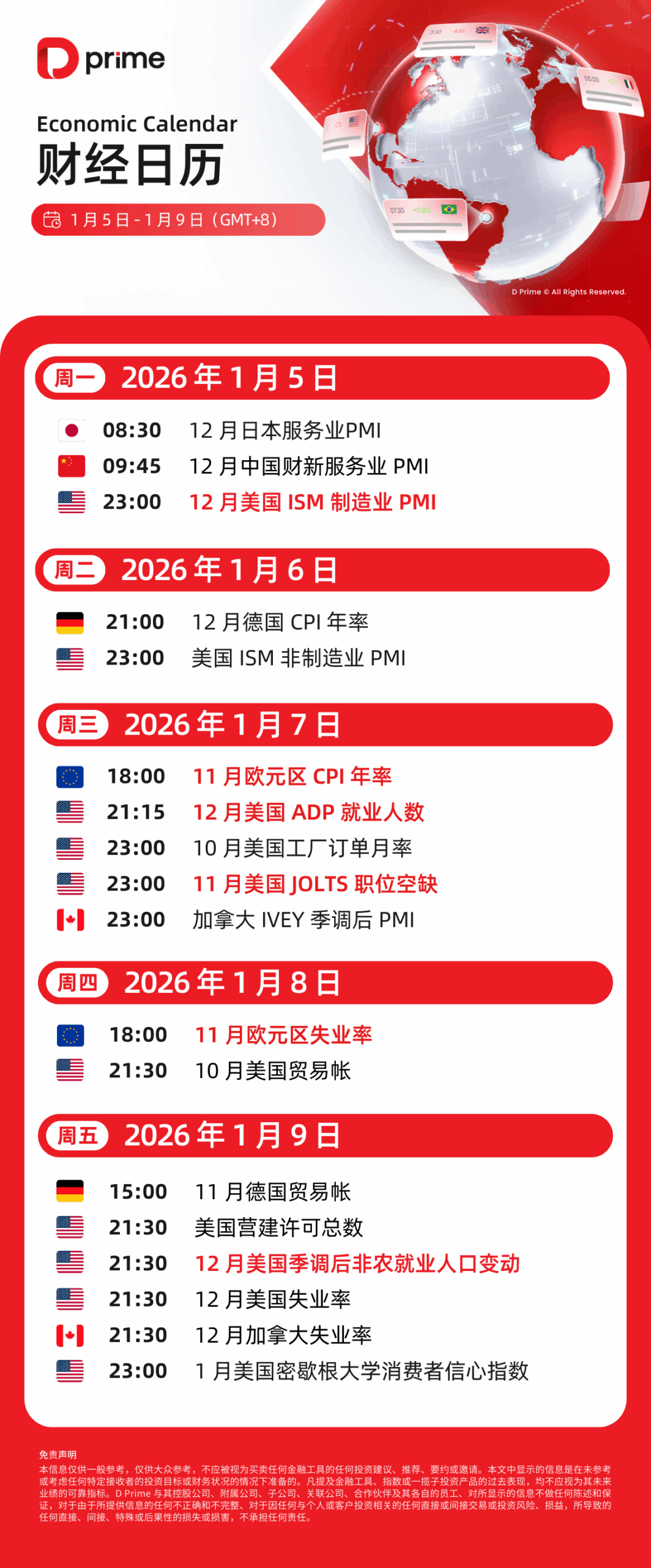 财经日历 | 以下为 2025 年 1 月 5 日至 2025 年 1 月 9 日(GMT+8 北京时间) 全球重大经济事件提醒。在重大行情期间,请确保您已审查您的保证金率,并有足够的保证金来支撑您的风险敞口。