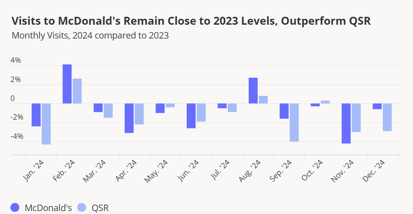 根据第三方数据 Placer.ai 统计,麦当劳 2024 年每个月的客流量表现参差不齐,许多月份的客流量较 2023 年下滑,反映了快餐店(QSR)领域正面临诸多挑战。