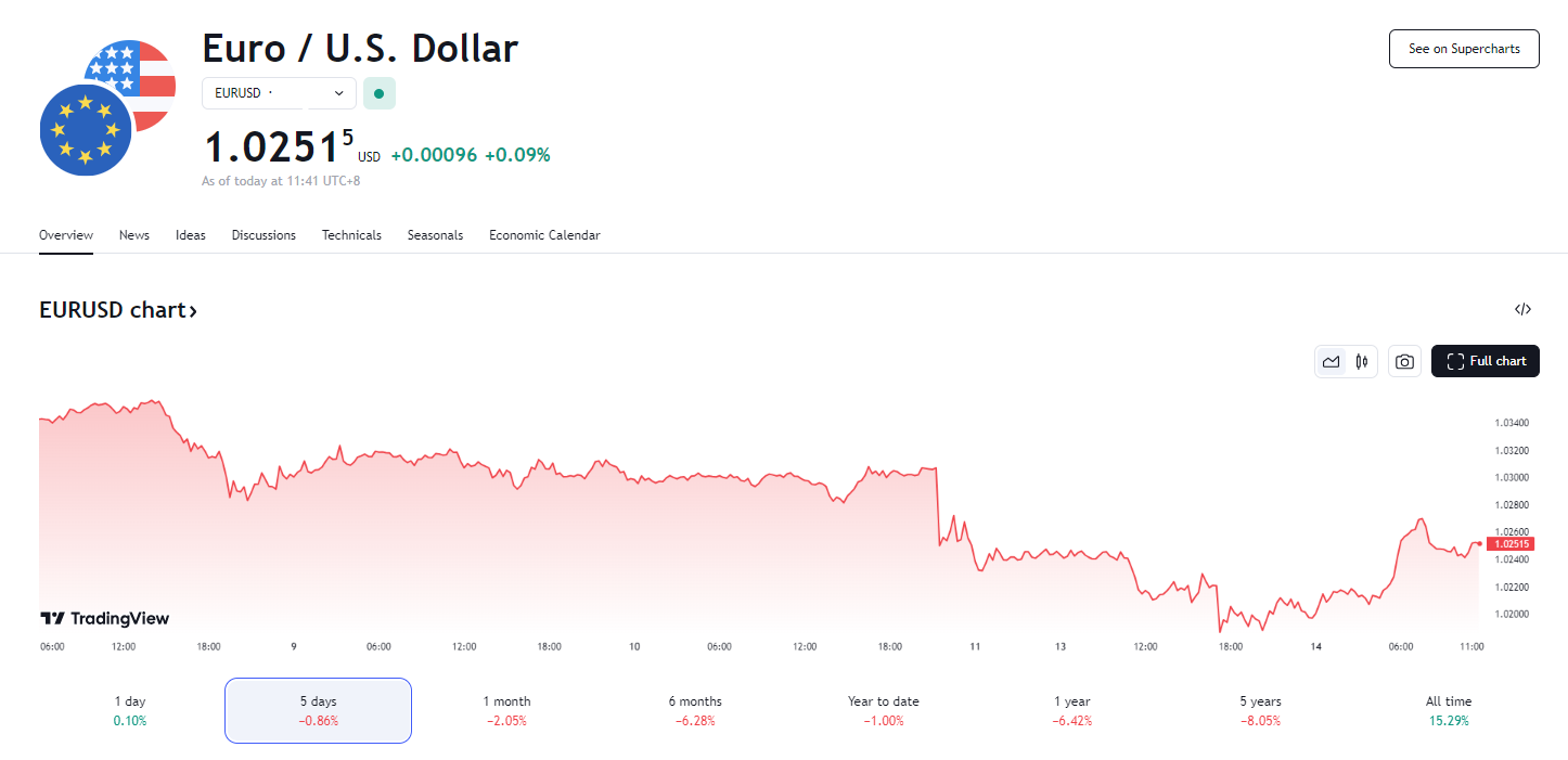 同日,欧元兑美元日内一度跌至 1.0177,也是两年多来最接近“平价”,即 1:1 汇率的水平;英镑兑美元则跌至 1.2100,为 2023 年 11 月以来的最低汇率。
