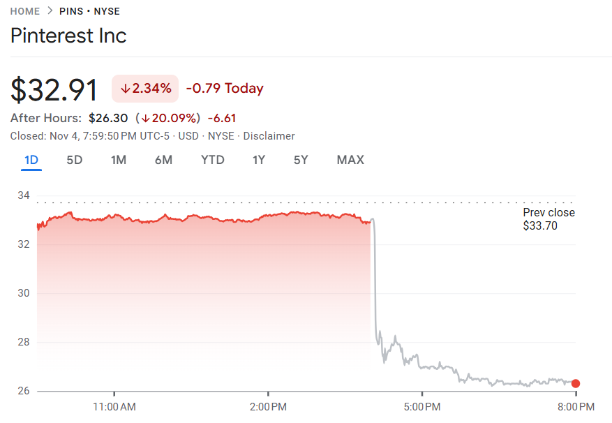 11 月 4 日至 5 日 ,Pinterest(PINS)发布第四季度营收指引,预计营收仅为 131 至 134 亿美元,低于市场预期中值,显示广告业务增长放缓,即便进入假日营销旺季,短期反弹动力仍显不足。