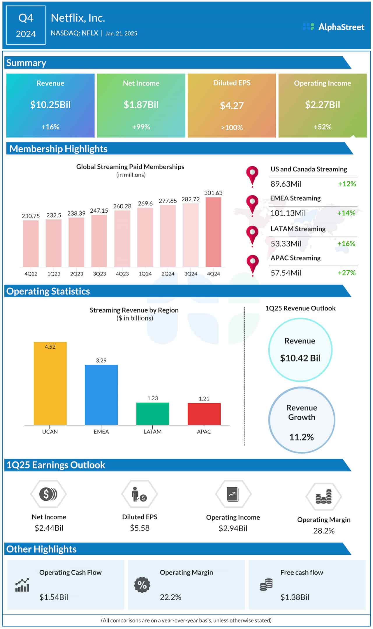 - 利润:净利润同比增 99% 至 18.7 亿美元,营业利润同比增长 52% 至 22.7 亿美元,营业利润率 22%,高于 2023 年四季度的 17% 且高于公司指引;