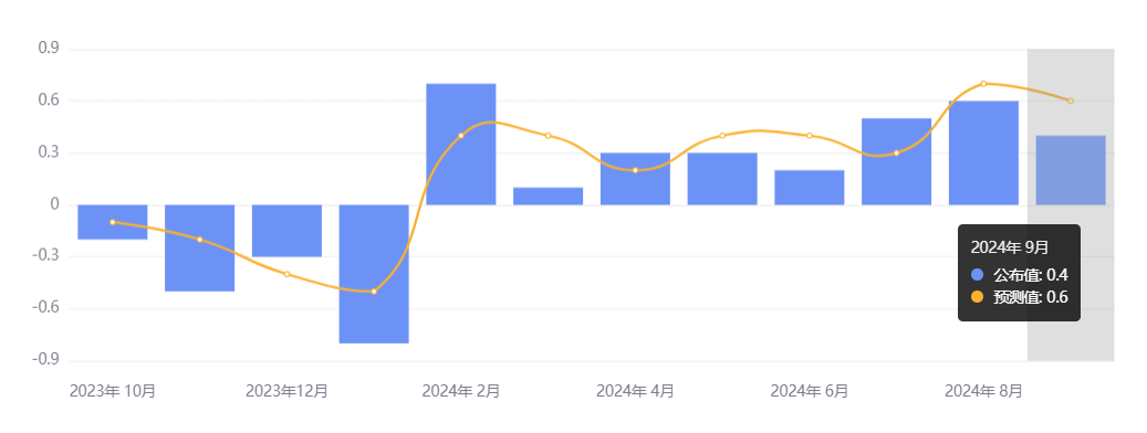 10 月 13 日,中国国家统计局公布数据显示,全国 9 月CPI 同比上涨 0.4%,前值为 0.6%;环比持平,较前值 0.4% 有所回落。国家统计局城市司首席统计师董莉娟表示,受开学季叠加中秋节日因素等影响,鲜菜、鸡蛋、鲜果和猪肉价格分别上涨 4.3%、2.5%、2.1% 和 0.4%。