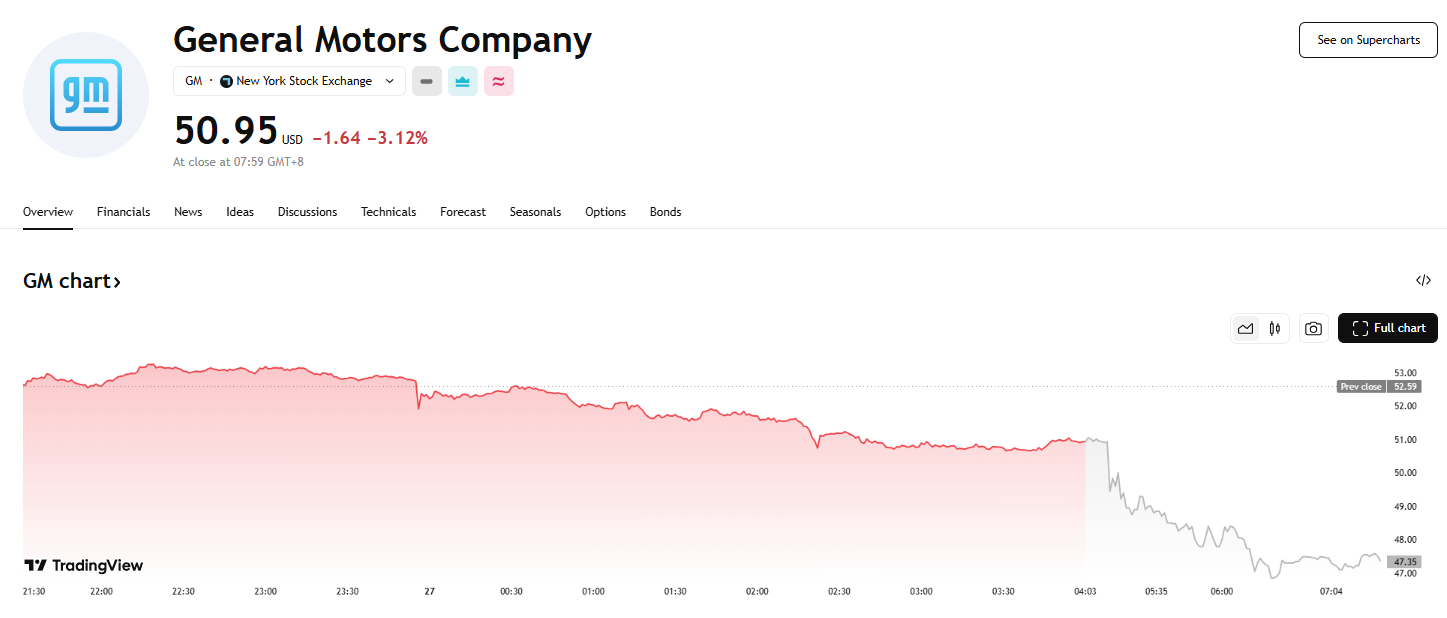 特朗普宣布汽车关税后,传统汽车厂商盘后普遍下跌。通用汽车盘后跌 5%,福特汽车盘后跌超 3%,丰田美股盘后跌超 1%。
