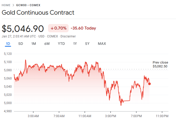 周一(1 月 26 日)纽约尾盘,国际贵金属市场剧烈震荡。现货黄金上涨 0.24%,收报每盎司 4,999.37 美元。盘中北京时间 14:51 曾触及历史新高 5,111.07 美元,全天大部分时间交投于 5,060 美元上方。但自美盘后段起,价格出现两波明显回吐,涨幅显著收窄。