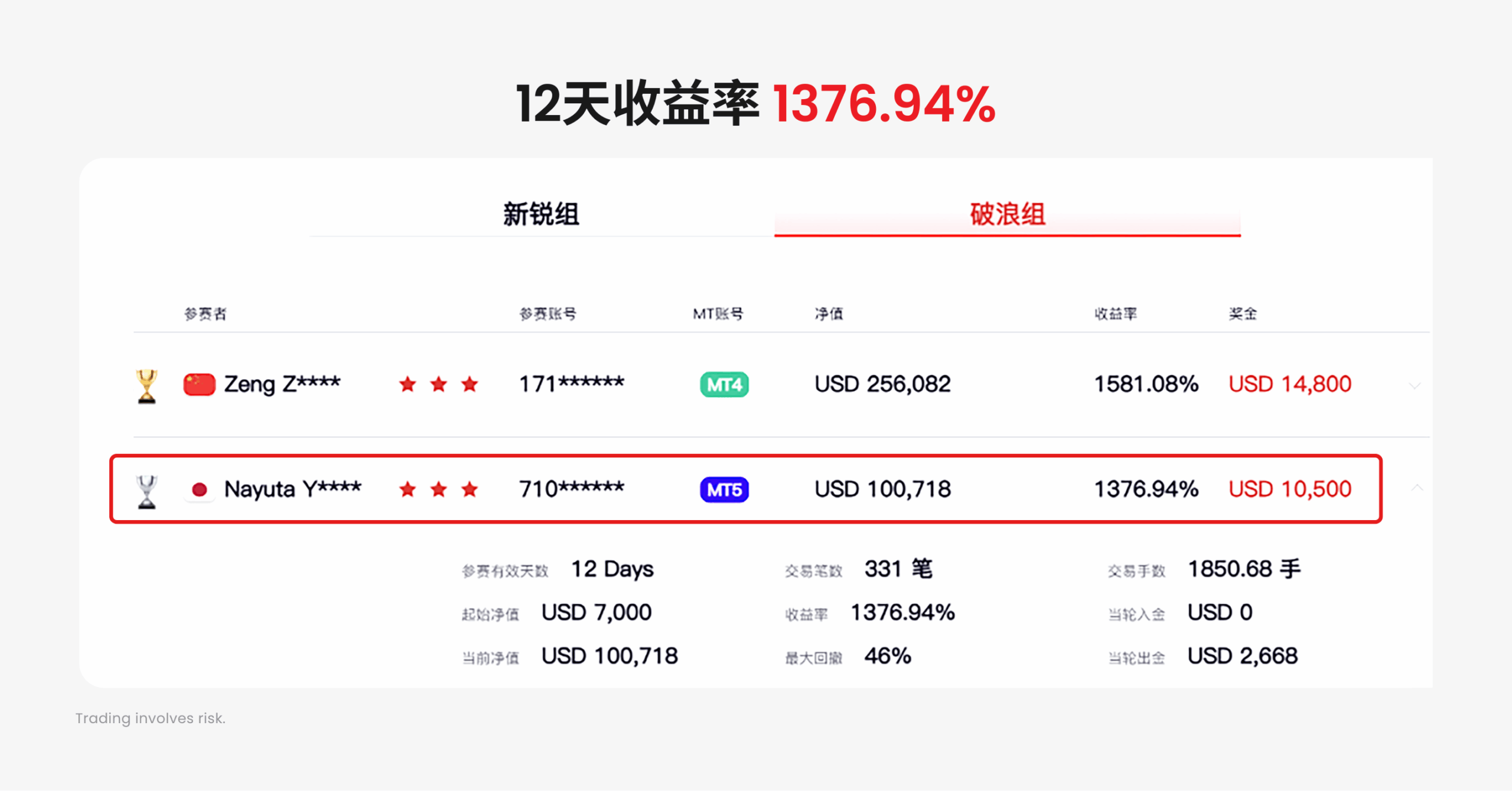 但却有那么一些“非主流”交易员,他们专门在震荡市中进进出出,别人恐惧他贪婪,从而赚到了惊人的收益。来自日本的 Nayuta Yokoyama(横山なゆた),在 12 天中狂揽 1376.94% 的收益率,在第二轮月赛中斩获破浪组第二名的佳绩。