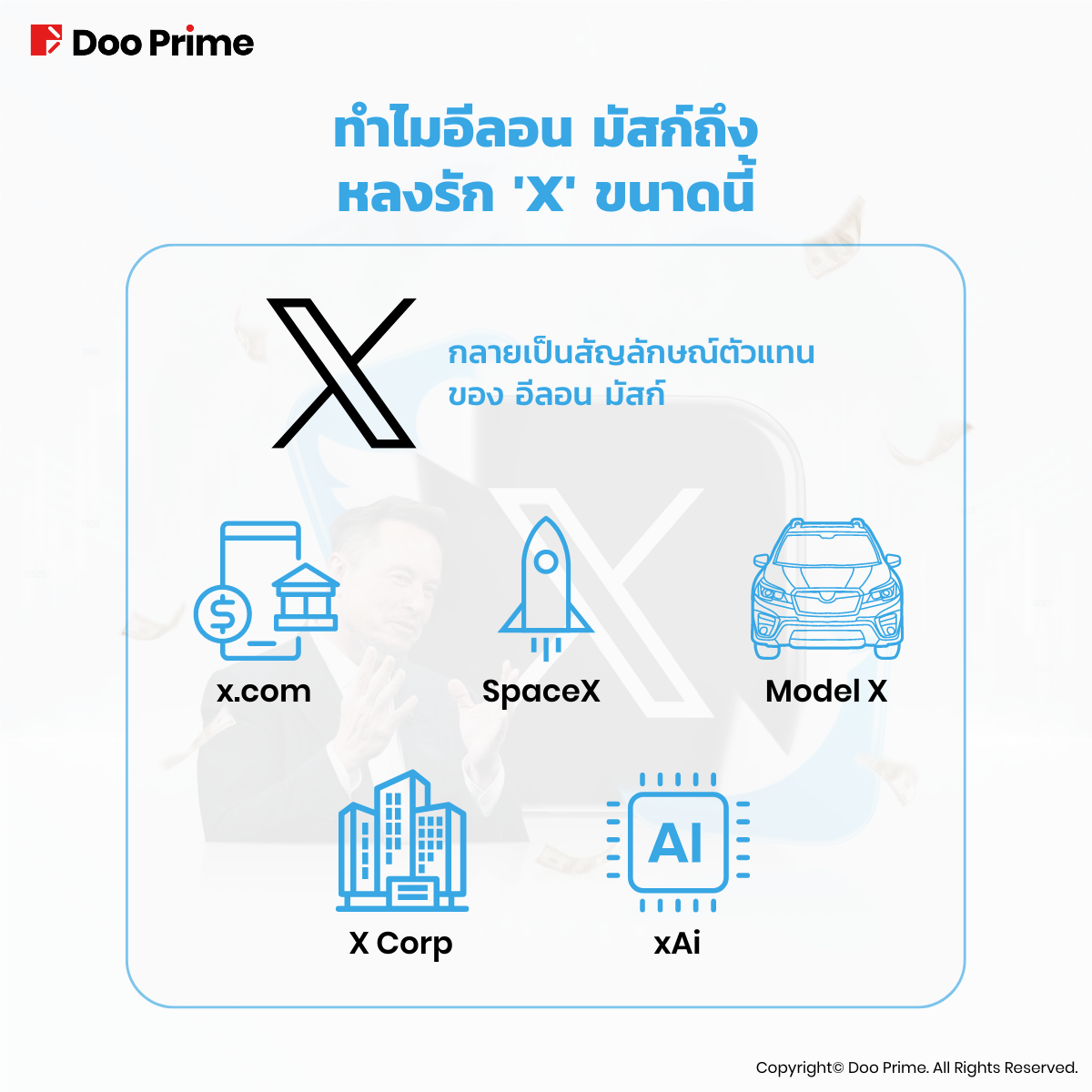 นอกจากนี้ บริษัทสำรวจอวกาศของ Musk ซึ่งก่อตั้งขึ้นในปี 2002 มีชื่อว่า “SpaceX” ในปี 2015 บริษัทรถยนต์ไฟฟ้าและพลังงานอย่าง Tesla ของเขาได้เปิดตัวรถที่เป็นสัญลักษณ์เรียกว่า “Model X” ยิ่งไปกว่านั้น ในปี 2023 Musk ได้จดทะเบียน “X Corp” เป็นบริษัทแม่ของ Twitter Musk ยังได้ก่อตั้งบริษัทด้านปัญญาประดิษฐ์ชื่อ “xAI” ขึ้นอีกด้วย