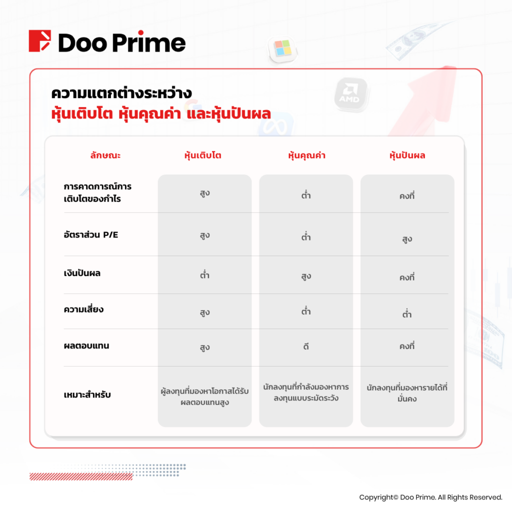 การลงทุนแต่ละประเภทขึ้นอยู่กับเป้าหมายการลงทุนและความเสี่ยงที่นักลงทุนแต่ละคนยอมรับได้ หากเป้าหมายของคุณคือการได้รับผลตอบแทนสูง หุ้นเติบโตอาจเป็นคำตอบให้คุณได้ ในทางกลับกัน หากคุณชอบวิธีแบบระมัดระวัง หุ้นคุณค่า (Value Stock) หรือหุ้นปันผล (Dividend Stock) อาจเป็นตัวเลือกที่เหมาะสมกับคุณ